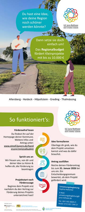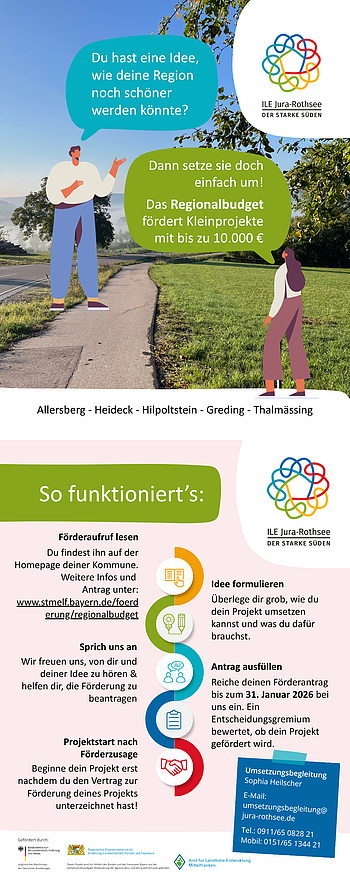 Die ILE Jura-Rothsee beabsichtigt für das Jahr 2026 die Förderung eines Regionalbudgets zu beantragen. Die ILE Jura-Rothsee ist ein Zusammenschluss der fünf Kommunen Markt Allersberg, Stadt Greding, Stadt Hilpoltstein, Stadt Heideck und Markt Thalmässing.