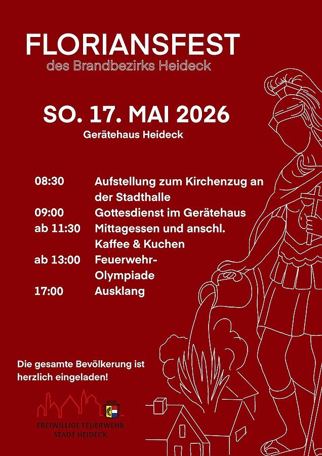 Das Floriansfest des Brandbezirks Heideck wird 2026 von der Stützpunktfeuerwehr Heideck ausgetragen. Hierzu sind alle Feuerwehren des Brandbezirks sowie die gesamte Bevölkerung herzlich eingeladen.