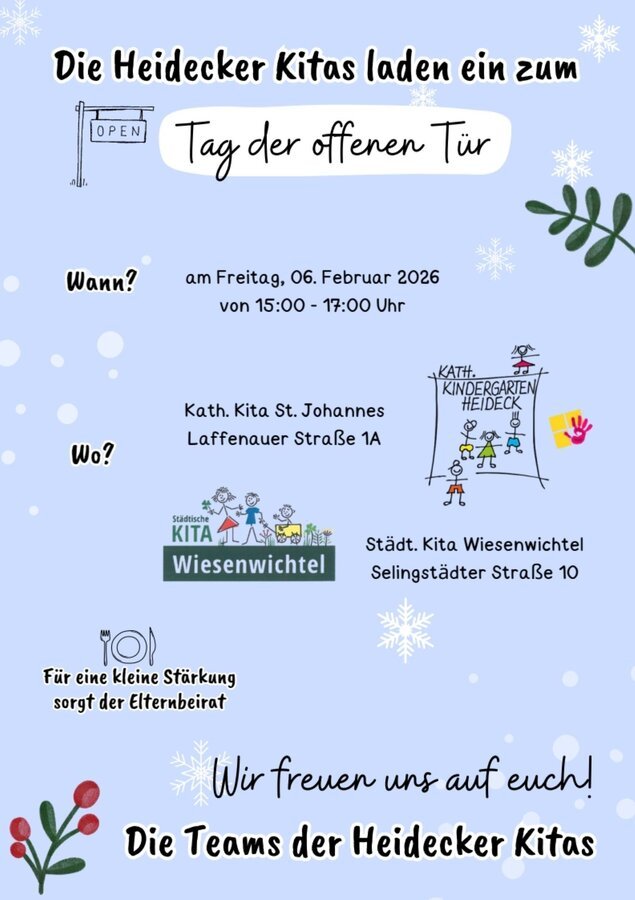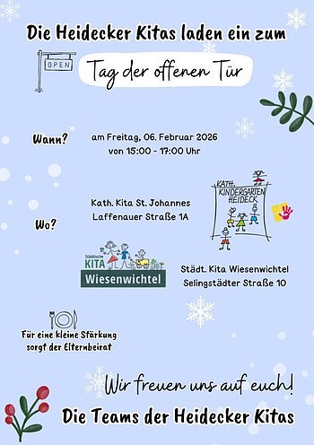 Wir freuen uns auf euch! Die Teams der Heidecker Kitas laden ein zum Tag der offenen Tür am Freitag, 06. Februar 2026 von 15:00 - 17:00 Uhr